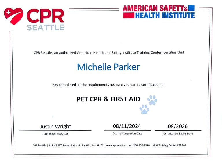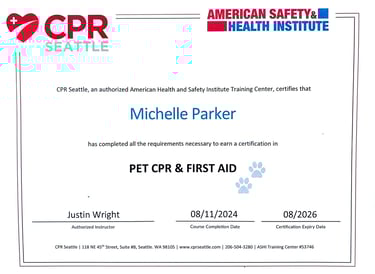 At Parker's Pawadise, your dog will experience exceptional care and endless fun. Whether it's through our VIP excursions, or dog-sitting services, every pup is treated like royalty with plenty of love and attention. While we love pampering pups, the safety of your pet is our utmost concern. Notably, Michelle is certified by CPR Seattle in pet CPR and first aid.